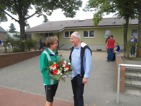 Sabine Preuß als Leiterin der Abteilung Leichtathletik des SV Motor Eberswalde empfängt Blumen für die erfolgreiche Zusammenarbeit von Steffen Reiche, Präsident des Leichtathletikverbandes Brandenburg
