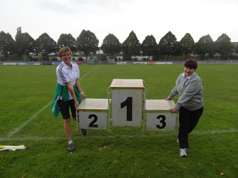 Einer der letzten Arbeitsschritte gegen 17.30 Uhr: Sabine Preuß und Ulrike Glanz räumen das Siegerpodest auf.