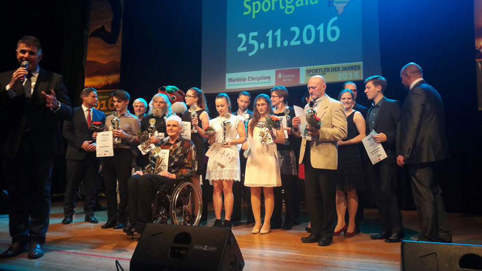 Die „Grande Dame“ der Leichtathletik, Marianne Buggenhagen, wird wie erwartet mit deutlichem Abstand zur Siegerin bei den Frauen gewählt. Die sympathische Diskus-Werferin im Behindertensport kürte ihre großartigen Leistungen in diesem Sport mit Silber bei den Olympischen Spielen in Rio. Sie rechne damit, dass es sogar noch Gold werde, denn die Doping-Kontrolle der Gewinnerin aus China sei noch nicht abgeschlossen. Eine weitere Medaille wird es trotzdem nicht geben, machte die 63-Jährige deutlich. „Ich denke, es war jetzt an der Zeit“, sagt die Bernauerin, die ebenfalls vom Publikum mit lautstarkem Applaus belohnt wird. Genau wie Tischtennisspieler Siegfried Lemke, den der Gedanke an sein Ausscheiden im Viertelfinale der Weltmeisterschaft immer noch schmerzt. Aber inzwischen kann sich der 77-Jährige, der seinen Titel als „Sportler des Jahres“ verteidigte, trotzdem wieder über den Gewinn des Doppel-Weltmeisters freuen.